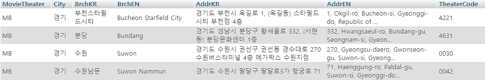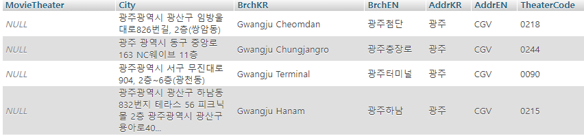 MovieTheater의 경우 "CGV, MB, LC"로 지정 해줘서 넣어 주기 때문에 null이 절대 들어 가지 않습니다...