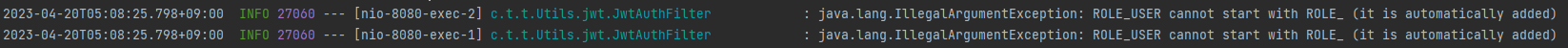 서버/Kotlin-Spring_Boot Axios, Spring Security 403 혹은 network err 날 때 해결 방법 by HDobby 2023. 4. 20. Spring Security 에 authentification중 자동으로 role을 검사합니다. 이 때 ROLE_을 붙이고 검사하니 붙이지 말라고 하여 enum과 role을 전부 수정해주니 해결 됩니다.. role에서 ROLE_를 때주면 해결됩니다... 728x90 공유하기 게시글 관리 HDobby '서버 > Kotlin-Spring_Boot' 카테고리의 다른 글 Suspend function 'await' should be called only from a coroutine or another suspend function (0) 2023.05.26 jdbctemplate Connection org.mariadb.jdbc.Connection@4c3269f marked as broken because of SQLSTATE(08000), ErrorCode(1220) java.sql.SQLNonTransientConnectionException: (conn=3610) Connection is closed (0) 2023.05.25 Could not autowire. No beans of 'JavaMailSender' type found. 에러 해결 (0) 2023.04.11 JpaRepository SQLInsert ID column 순서 바뀜 주의... (0) 2023.03.12 QueryDsl jakarta 설정 방법 (0) 2023.02.10 관련글 Suspend function 'await' should be called only from a coroutine or another suspend function jdbctemplate Connection org.mariadb.jdbc.Connection@4c3269f marked as broken because of SQLSTATE(08000), ErrorCode(1220) java.sql.SQLNonTransientConnectionException: (conn=3610) Connection is closed Could not autowire. No beans of 'JavaMailSender' type found. 에러 해결 JpaRepository SQLInsert ID column 순서 바뀜 주의... 댓글