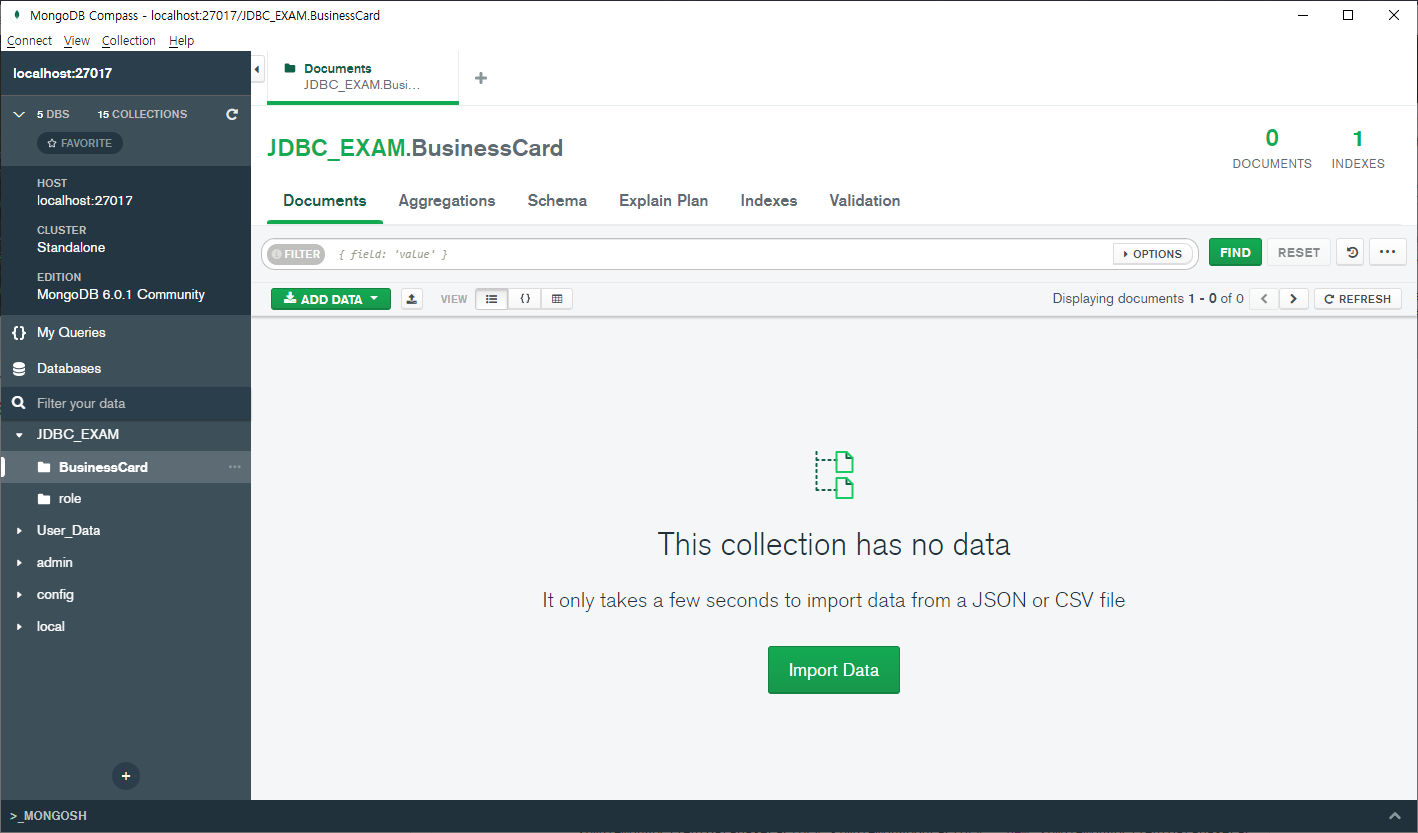 String uri = "mongodb://localhost:27017/JDBC_EXAM";