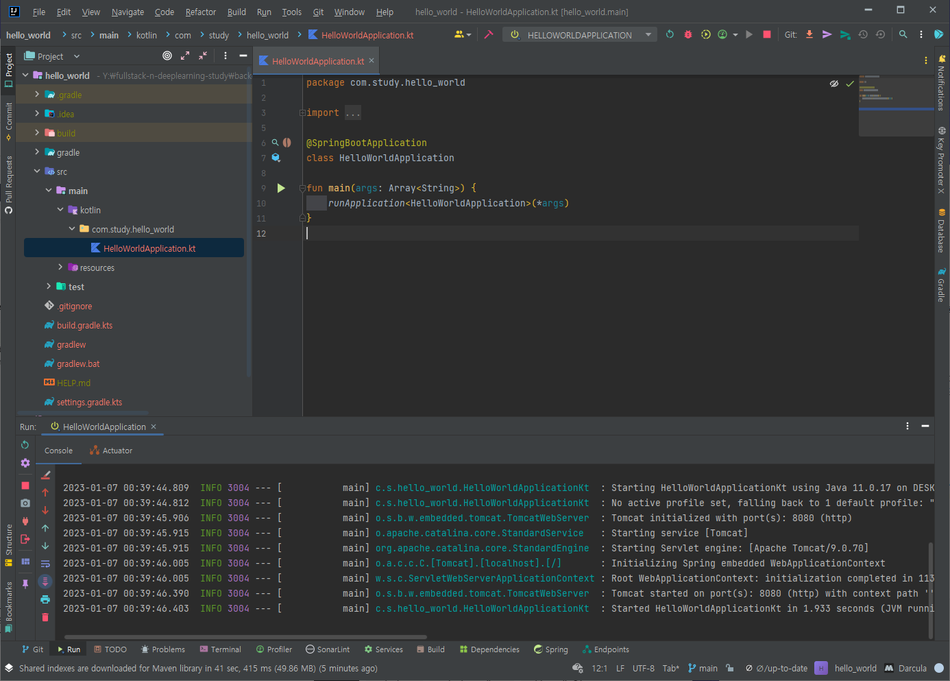 실행된 화면입니다. 좌측에 src > main > kotlin > 정하신 이름 폴더에 있는 kotlin파일을 열어 줍니다.