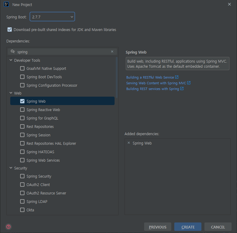 Spring Web을 추가 해줍니다.