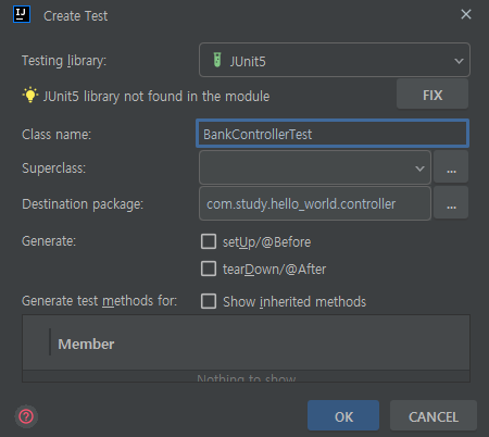 BankControllerTest를 제작해줍니다. 이곳에서 수행할 테스트는 해왔던 것들과는 조금 다릅니다.