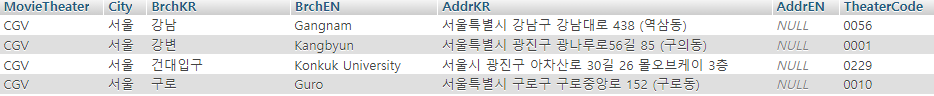 MovieTheater의 경우 "CGV, MB, LC"로 지정 해줘서 넣어 주기 때문에 null이 절대 들어 가지 않습니다...